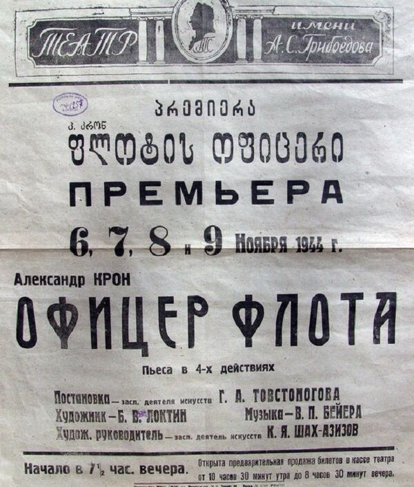 И, конечно, безусловным украшением репертуара стали спектакли Георгия Товстоногова, который пришел в Грибоедовский выпускником ГИТИСа, прослужил здесь с 1938-го по 1946 год и поставил 14 спектаклей, среди которых – «Дети Ванюшина» С. Найденова, «Парень из нашего города» К. Симонова, «Школа злословия» Р. Шеридана, «Собака на сене» Лопе де Вега, «Ночь ошибок» О. Гольдсмита, «Бешеные деньги» А. Островского, «Ленушка» Л. Леонова, «Лисички» Л. Хеллман и другие замечательные постановки. Кстати, в Тбилиси случился и первый рекорд Товстоногова – спектакль «Бешеные деньги», поставленный им в 1942 году, прошел 108 раз! Для полноты картины добавим, что в это же военное время Товстоногов активно ставил спектакли и в Тбилисском ТЮЗе, и на сцене Театрального института. А также, по приглашению директора института, Народного артиста СССР Акакия Хорава, преподавал в Театральном институте актерское и режиссерское мастерство. Товстоногов воспитал несравненную плеяду мастеров, которыми Грузия гордится по праву: Михаил Туманишвили, Гига Лордкипанидзе, Георгий Гегечкори, Медея Чахава, Тенгиз Абуладзе, Резо Чхеидзе…