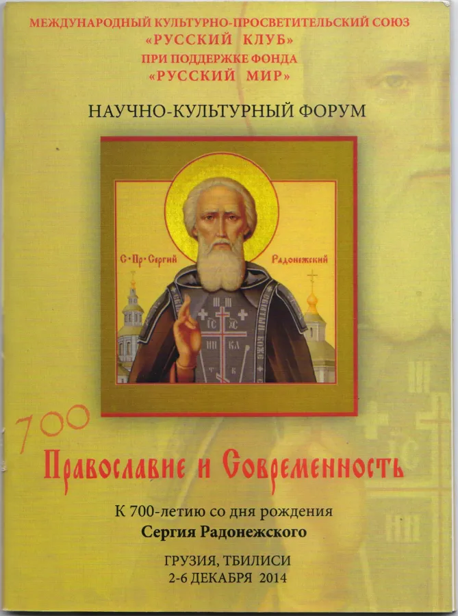 2-6 декабря 2014 года в Тбилиси прошел международный научно-культурный форум, посвященный 700-летию со дня рождения Сергия Радонежского. Форум открылся аудиенцией у Католикос-Патриарха Всея Грузии, Илии II. Одобрив проведение форума в столице Грузии, Святейший приветствовал гостей и, рассказав о 8-ми годах своей учебы в Московских духовных семинарии и академии, подчеркнул, что Сергий Радонежский – один из наиболее почитаемых им святых Русской Православной Церкви. Он выразил надежду, на то, что отношения между Россией и Грузией улучшатся, и народы обеих стран будут чувствовать братскую помощь друг друга. На аудиенции Валентин Никитин, доктор философии, академик РАЕН, сообщил, что во многих своих работах руководствуется трудом «История афонского Иверского монастыря», за который Илия II получил в Московской духовной академии степень кандидата богословия. Генеральный директор Дома русского зарубежья имени Александра Солженицына Виктор Москвин подчеркнул, что в России с восхищением следят за деятельностью ее предстоятеля, для которого главное – дружеские отношения между людьми. Писатель, культуролог, президент Кантовского общества в Калининграде Борис Бартфельд говорил о том, что пора положить конец расхождениям между Россией и Грузией и что вся надежда в этом благородном деле – на грузинского Патриарха. Участники аудиенции прослушали духовные песнопения, созданные Илией II. Гостям были вручены памятные подарки. 3 декабря в Малом зале Тбилисского государственного русского драматического театра имени А. С. Грибоедова состоялось открытие форума. С приветственным словом выступил президент Международного культурно-просветительского Союза «Русский клуб» Николай Свентицкий. Участникам форума был показан документальный фильм, посвященный жизни и деятельности преподобного Сергия Радонежского. Публичную дискуссию на тему «Православие – это современность?» провел координатор отдела по международным связям Союза писателей Грузии, доктор филологии Владимир Саришвили. 4 декабря в Конференц-зале театра им. А. С. Грибоедова прошла научно-практическая конференция «Православие и современность». Ее ведущими стали Валентин Никитин и Мария Филина (профессор ТГУ им. Ив. Джавахишвили, доктор филологических наук). Были заслушаны и обсуждены доклады: Ирина Багратион-Мухранели. Единство православия. На пути к диалогу. Борис Бартфельд. Юбилей преподобного Сергия Радонежского: отражение в информационном пространстве – взгляд сквозь призму гражданского общества. Инна Безирганова. «Несвятые святые» и другие рассказы. Опыт православной литературы. Давид Гоциридзе. Хронотоп существования в языковых фактах. Георгий Жужунашвили. О некоторых вопросах из истории церковных взаимоотношений России и Грузии. Валерий Лепахин. Две житийные иконы преп. Сергия Радонежского. Татьяна Мегрелишвили. Перечитывая Достоевского в эпоху постмодерности. Валентин Никитин. От Иверской обители на Афоне – к Троице-Сергиевой на Маковце (Иноческие уставы грузин-святогорцев и духовное наследие преп. Сергия Радонежского). Владимир Саришвили. «Север духа» (литературный образ преподобного Сергия Радонежского). Мария Филина. Григол Перадзе – православный святой в католическом мире. По окончании конференции участники совершили поездку в исторический регион Грузии 